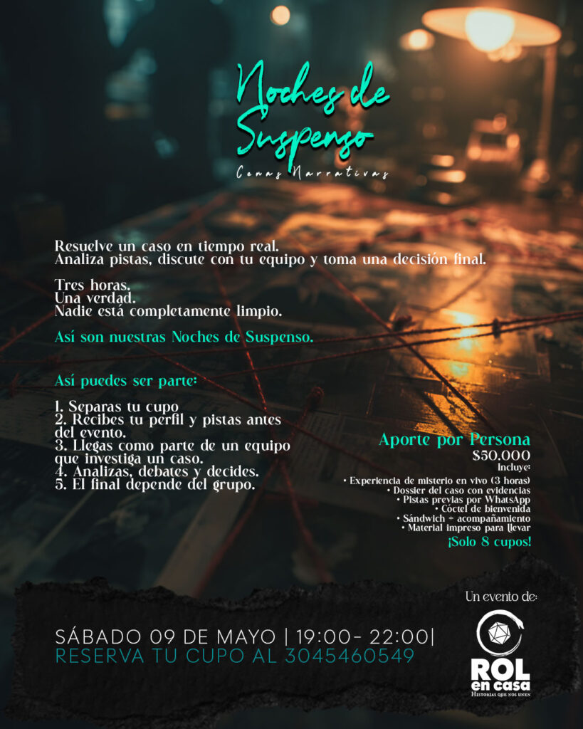 En Bogotá empieza a consolidarse un formato que se mueve entre el juego, la narrativa y la experiencia social: Noches de Suspenso, una actividad en vivo donde un grupo de personas se reúne para resolver un caso en tiempo limitado.